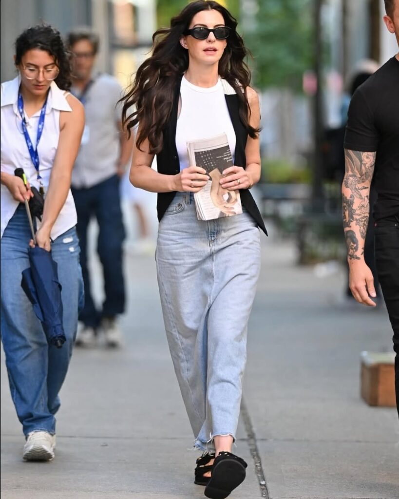 جمعت هاثاواي بين الراحة والأناقة في إطلالة ثالثة، حيث ارتدت بلوزة بيضاء من Totême مع جاكيت مفتوح، ونسقتها مع تنورة دنيم ماكسي وصندل مفرغ من Chanel. هذه الإطلالة تبرز أسلوب المرأة العصرية التي تتنقل بثقة بين أنشطتها اليومية.